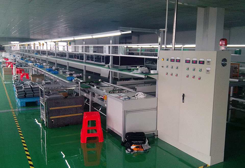 來料測試線機(jī)架腳架采用優(yōu)質(zhì)方通組焊制作,每2米一段,采用鍍鋅可調(diào)腳杯;線體皮帶護(hù)邊采用方管制作,沿線體兩側(cè)一路布置;承載采用鍍鋅滾筒,中心間距200㎜安裝一條,全線布置;輸送帶采用綠色PVC防靜電皮帶,厚2mm、寬500mm無縫熱縮接駁,皮帶面低于機(jī)身護(hù)邊8㎜;照明系統(tǒng):采用優(yōu)質(zhì)方管組焊制作,選用40W單支帶罩T8電子節(jié)能支架,全線布置。工作臺: 配對面坐工作臺,優(yōu)質(zhì)木夾板制作,面貼綠色防靜電膠皮,半圓木條包邊。