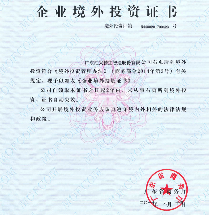 2017年8月29日,廣東匯興精工智造股份有限公司(股票代碼:839258)正式獲得企業(yè)對(duì)外投資證書。匯興智造赴德設(shè)立全資子公司,是響應(yīng)國(guó)家‘一帶一路’這個(gè)偉大重要的戰(zhàn)略,從而實(shí)現(xiàn)公司可持續(xù)發(fā)展。“一帶一路”戰(zhàn)略的實(shí)施,為我們民營(yíng)企業(yè)“走出去”創(chuàng)造出了難得的歷史機(jī)遇。新的機(jī)遇,既要看天氣,更要接地氣,推動(dòng)企業(yè)國(guó)際化,從來(lái)不是紙上談兵,而是爭(zhēng)取如何落到實(shí)處。