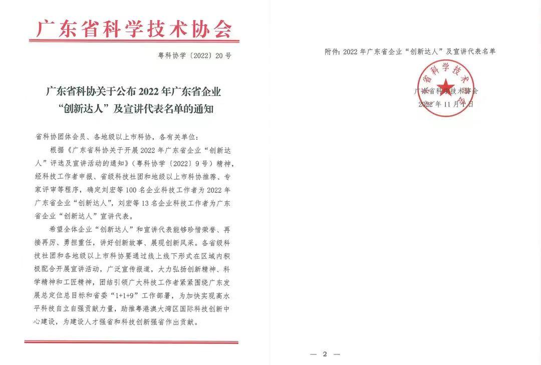 ”講好創(chuàng)新故事 、 展現(xiàn)創(chuàng)新風(fēng)采“2022年11月15日,由廣東省科學(xué)技術(shù)協(xié)會(huì)開展的2022年廣東省企業(yè)“創(chuàng)新達(dá)人”評選活動(dòng)中,經(jīng)科技工作者申