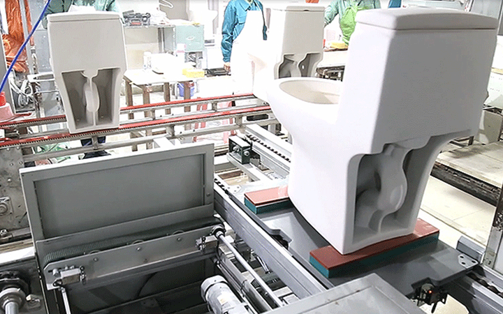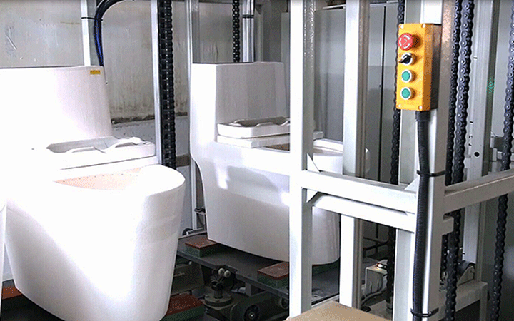 馬桶整廠自動化生產(chǎn)線是由坯體自動輸送干燥存儲、機(jī)器人打磨修坯、機(jī)器人噴釉、組裝、測試、成品包裝等階段組成,此自動化生產(chǎn)線提高了工作環(huán)境性與潔凈度,降低員工的工作疲勞度,為員工從簡單勞動向智力勞動的轉(zhuǎn)移,終實(shí)現(xiàn)馬桶整廠自動化生產(chǎn)。
