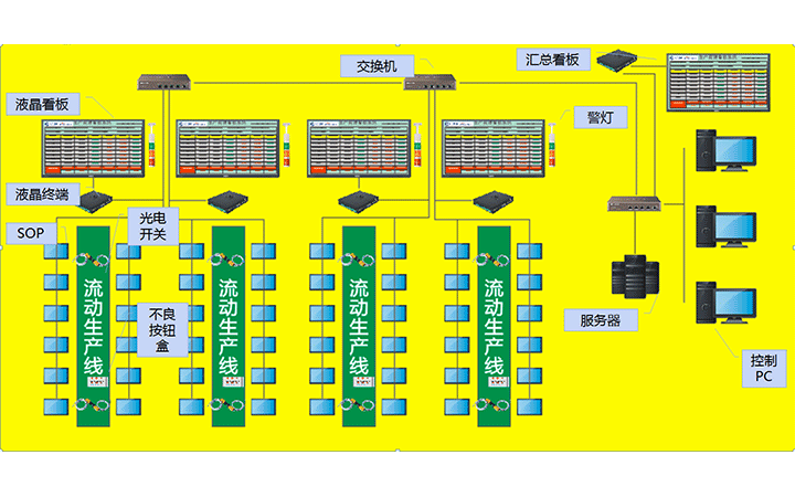 生產(chǎn)管理看板系統(tǒng)是指用于車間或生產(chǎn)線目視化管理(VM,Visual Management)的一種表現(xiàn)形式,即對數(shù)據(jù)、生產(chǎn)狀態(tài)等的情況一目了然地表現(xiàn),主要是對于生產(chǎn)進(jìn)度、生產(chǎn)狀態(tài)進(jìn)行的透明化管理設(shè)備。電子看板則通過利用形象直觀而又色彩適宜的各種視覺感知信息來組織現(xiàn)場生產(chǎn)活動,了解實(shí)時的生產(chǎn)進(jìn)度、產(chǎn)能、以及不良數(shù)等等。生產(chǎn)管理看板是發(fā)現(xiàn)問題、解決問題的非常有效且直觀的手段,是優(yōu)異的現(xiàn)場管理必不可少的工具之一;它是6s的基本工具。