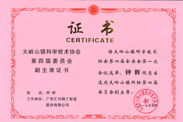 匯興智造鐘董任命大嶺山鎮(zhèn)科學技術協(xié)會副主席證書