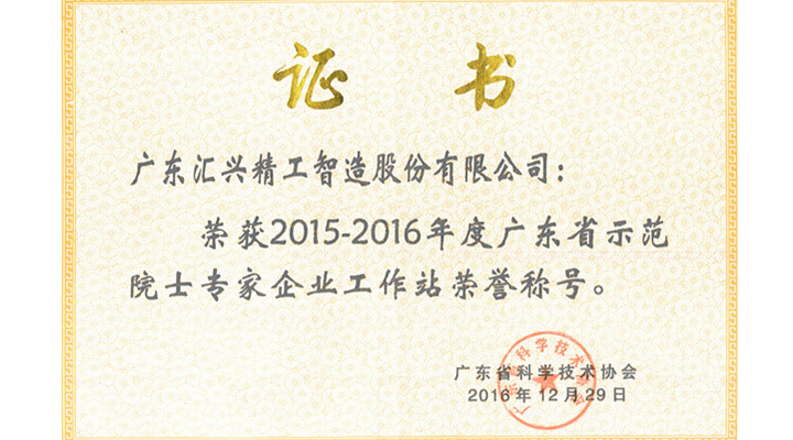 喜訊:匯興智造被評為2015—2016年度“廣東省示范院士專家企業(yè)工作站”
