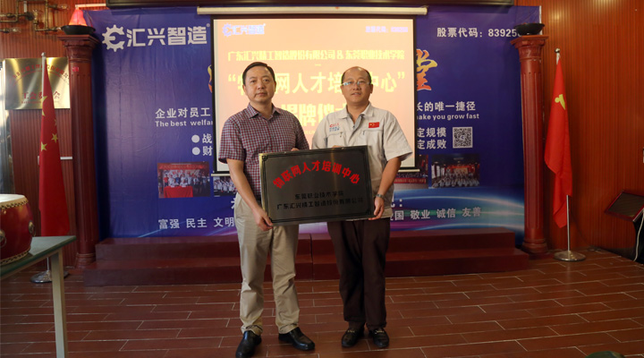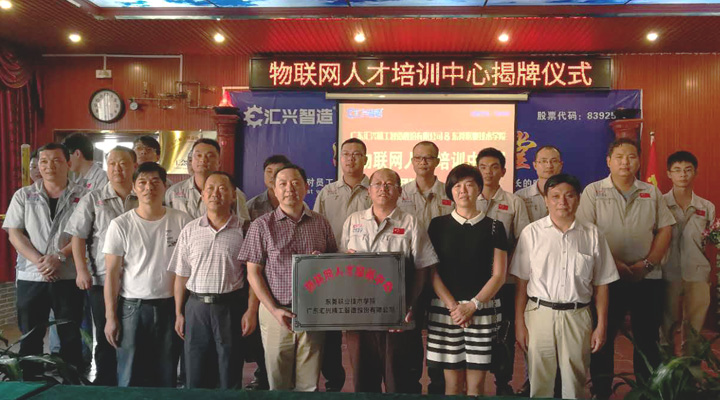 2017年9月27日下午, 東莞職業(yè)技術(shù)學院副院長楊云奇,計算機工程系主任胡選子博士,藝術(shù)設(shè)計系主任何鳳梅博士,計算機系曹文梁教授等專家人員一行蒞臨廣東匯興精工智造股份有限公司(股票代碼:839258)考察調(diào)研并舉行“物聯(lián)網(wǎng)人才培訓中心“基地揭牌儀式。匯興智造董事長鐘輝,匯興中德智能制造研究院院長李康順教授熱情接待了調(diào)研組一行。